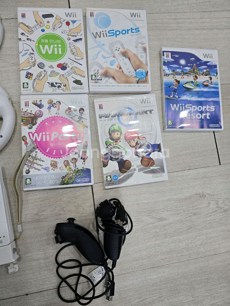 닌텐도 Wii 본체와 스포츠 게임 4개가 포함된 세트입니다. 리모컨과 전원 어댑터 등 구성품이 모두 있고, 사용감은 있지만 정상 작동합니다.