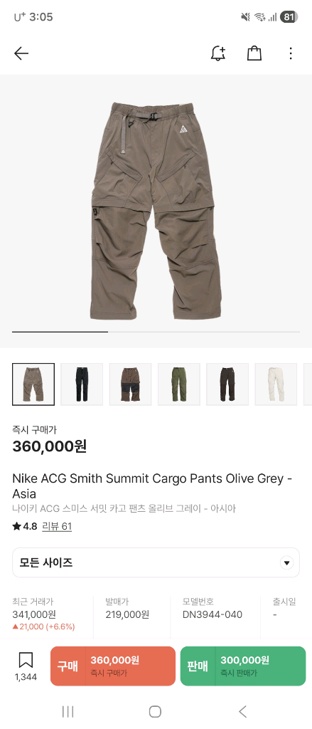 나이키 ACG 스미스 서밋 카고 팬츠 올리브 그레이 컬러입니다. 아시아 사이즈로 깔끔한 상태예요. 실용적인 카고 포켓 디자인으로 활용도 높은 아이템입니다.