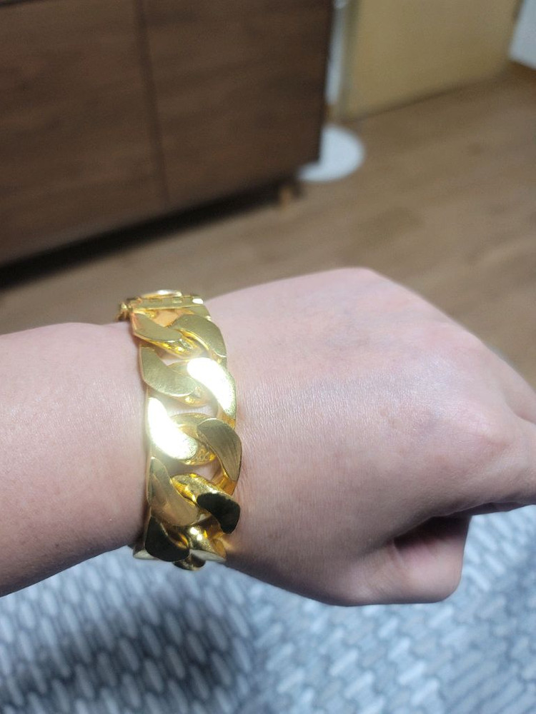 순금팔찌입니다 21센치. 순금100돈.18k고리2돈 순금돈당90만 18k돈덩65만 9130만입니다. 연결부위삼지창 디자인 넓이25센치 두께8미리 엄청넓고 두껍습니다. 맘에드실거에요. 직거래원합니다.금방동행가능.수원.용인 에서 직거래합니다.