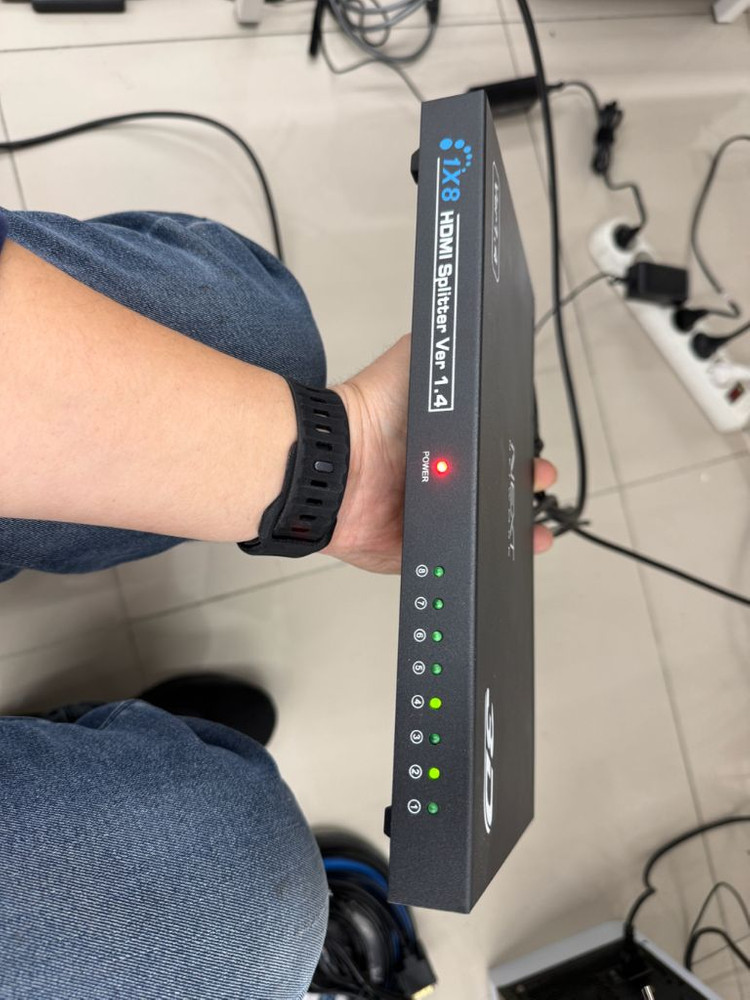 HDMI 분배기 판매합니다. 여러 개의 HDMI 입력을 하나의 출력으로 연결해주는 장비예요. 상태 양호하고 정상 작동 확인했어요. 1:8 HDMI 분배기 입니다