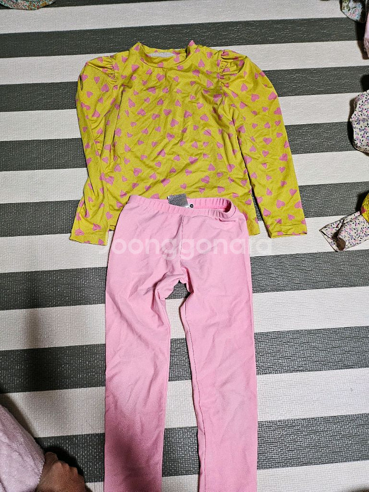 여아용 수영복 상하의 세트예요. 핑크와 그린 컬러로 귀여운 하트 패턴이 있고, 노란핑크가 120사이즈 뒷부분이 좀트였구여. 민트보라가 140상태좋아요 120은 15000원 140은 16000원 예민한분패스