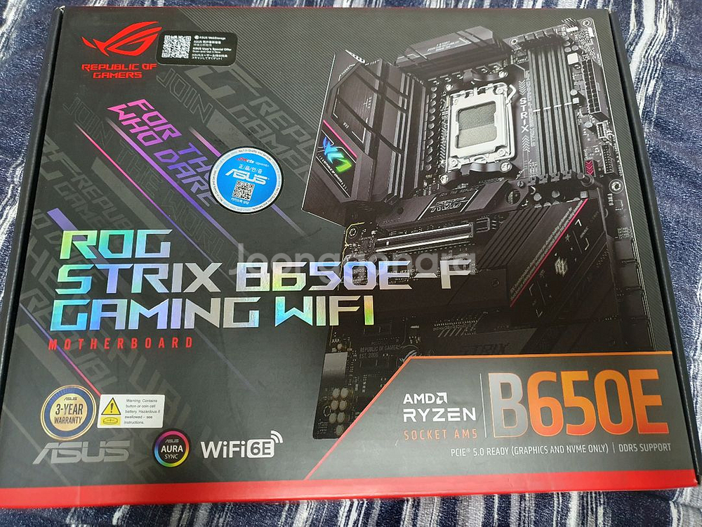 ASUS ROG STRIX B650E-F GAMING WIFI 무상A/S: 대원CTS (~27년 4월) 국내정품 풀박스 구성품 미사용 특이사항 없음 영수증O 올해 6월 미개봉 신품 구입후 대원CTS 방문 초기불량확인 및 바이오스 패치후 사용 PCIE5.0 및 AM5 지원 그래픽카드 레인공유 없음 (속도저하 이슈없는 몇 안되는 보드) 비흡연자이며 애완동물X 가정집 책상위에서 사용 직거래시 부천 범박동 범박지구대앞 택배거래시 우체국택배 +4000(파손면책동의) 환불X 교환X 흥정X