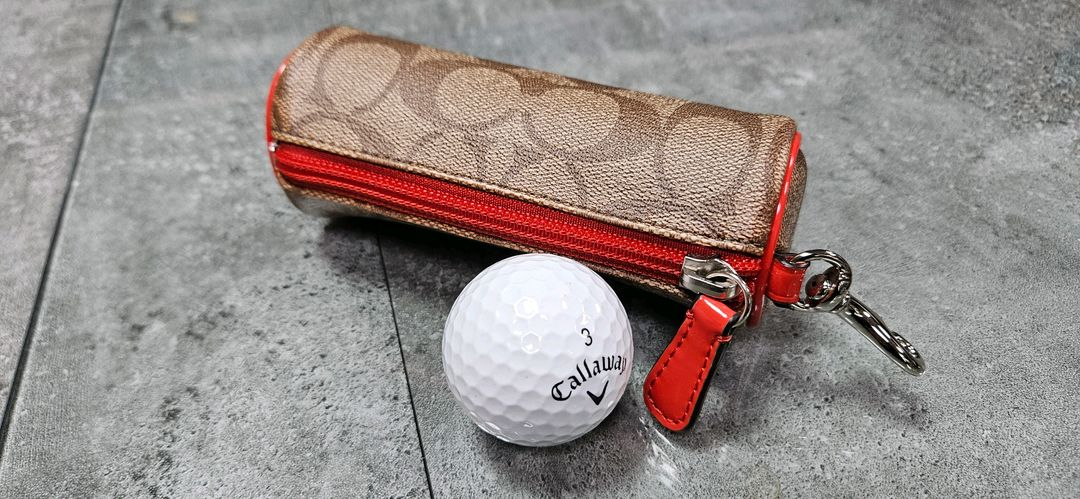 코치 시그니처 패턴의 고급스러운 골프볼 파우치예요. 레드 지퍼와 스냅 버튼으로 포인트를 준 디자인이고, 골프용품 보관이나 키링으로 활용하기 좋아요.