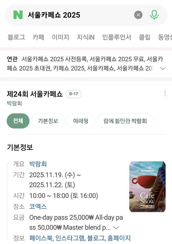 2025 서울카페쇼 티켓 양도합니다. 11월 19일부터 22일까지 코엑스에서 진행될 예정입니다. 커피에 대한 모든 것을 경험하고 싶다면 좋은 기회입니다. (정가: 1장당 25,000원) 방문하시는 분 성함 연락처로 등록 후 나오는 Qr을 키오스크에 찍으신후 입장권 받으시고 입장하시면 됩니다 행사명 : 제24회 서울카페쇼 ■ 기간 : 11/19(수)~22(토) - 비즈니스 데이: 11/19(수)~20(목) - 퍼블릭 데이: 11/21(금)~22(토) ■ 장소 : 코엑스 비즈니스데이 퍼블릭데이 상관없이 1일 선택하셔서 방문하실수 있는 입장권입니다 비즈니스데이 오늘 명함 없이 방문가능하셔요 모바일 입장권으로 바로 보내드립니다 등록 확인 바로 가능합니다