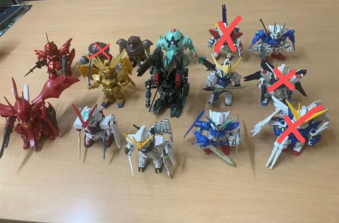 모두 반다이제 건담 SD 조립품입니다. 설명서는 있는건 따로 같이 챙겨드립니다. 대부분 이상없고 상태 A급 이상으로 좋습니다. 부분도색이나 올도색된 것이 있고, 무기추가된 것들이 있습니다. 이상있는건 설명에 기록해놓았어요. 구성 상태는 대부분 사진구성이며 설명 참고 바랍니다. 시난주 코팅 도색 1만원 레드프레임 : 부분도색 6천원 페넥스 무광 : 7천원 곡그&족크 : 각 8천원, 2종 일괄 1.2만원 뉴건담 : 부분도색 8천원 엑시아 세븐소드 : 부분도색 7천원 발바토스 부분도색 : 8천원 더블오 : 부분도색 및 무장추가 6천원 서전트 베르데 버스터 DX세트 : 부분도색, 1.5만원