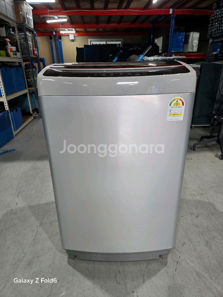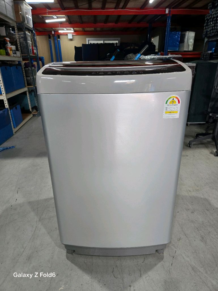 15kg 대용량 세탁기예요. 에너지효율 3등급이고 상태 양호합니다. 실버 컬러로 깔끔하고 세련된 디자인이에요. 사무실에 쓰던 거라 사용감 많지 않아요.