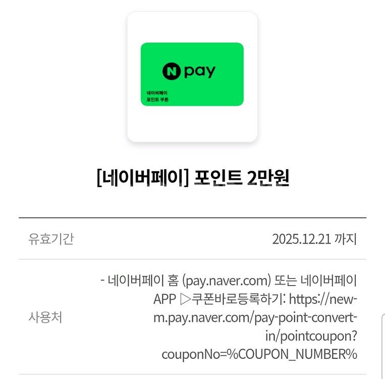 네이버페이 포인트 2만원권이에요. 2025년 12월 21일까지 사용 가능하고, 네이버페이 화면에서 바로 사용할 수 있어요!