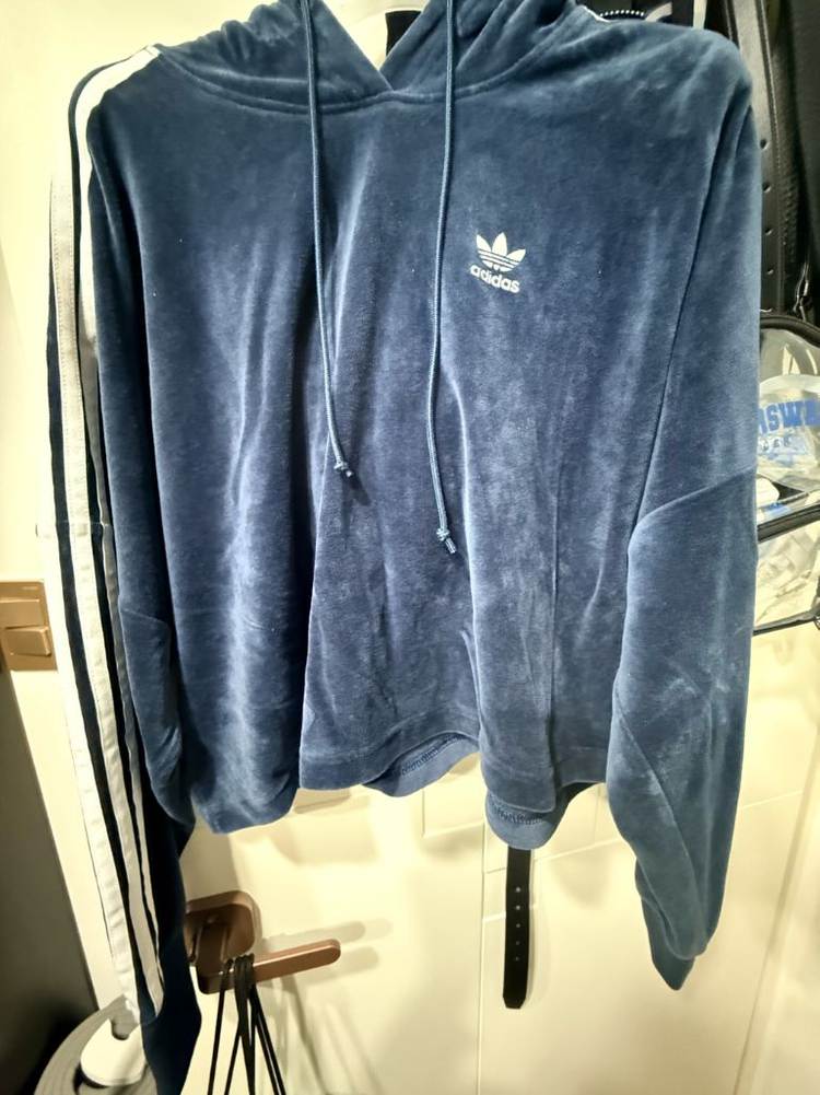 아디다스 벨벳 크롭후드티 L사이즈같은 XS 사이즈입니다. 부드러운 벨벳 소재로 되어있고, 색상은 네이비입니다. 소매 한쪽에 딱 하나 올풀림? 빼꼬는 거의 새것처럼 생태 좋습니다~ - 팔 부분에 흰색 삼선 포인트가 있습니다. - 사이즈는 박시한 XS입니다 - 재질은 면 79%, 폴리에스터 21%입니다 배송비는 별도 입니다~