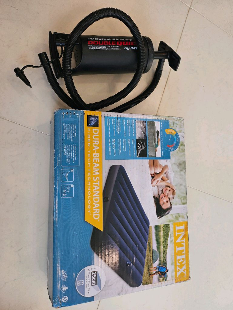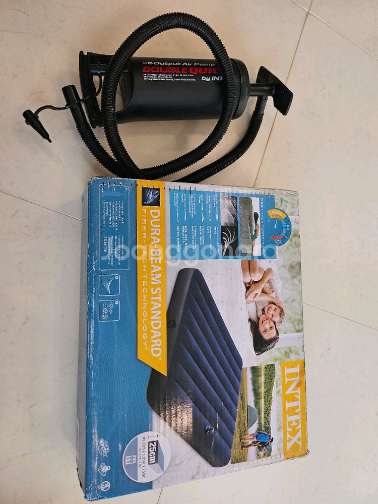 인텍스 듀라빔 스탠다드 에어매트 더블 사이즈입니다 5회 사용했습니다. 상태 좋습니다. 박스 있는것1개(1회사용)와 박스없는것1개(5회사용) 총 2개와 펌프 포함입니다. 일괄로 판매합니다. - 듀라빔 섬유 기술로 제작되어 내구성이 뛰어나요 - 25cm 높이로 편안한 사용감을 제공합니다 - 간편하게 공기를 주입할 수 있는 펌프도 함께 드립니다