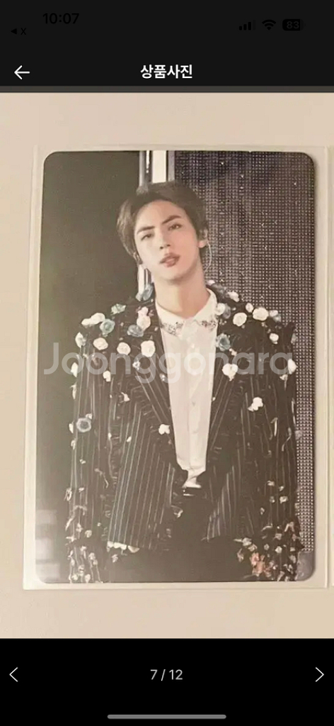 ※ 카페 상품 게시글은 자동으로 중고나라 앱/사이트에 노출합니다. 노출을 원하지 않으실 경우 고객센터로 문의 바랍니다. ※ 등록한 게시글이 회원의 신고를 받거나 이상거래로 모니터링 될 경우 중고나라 사기통합조회 DB로 수집/활용될 수 있습니다. ─────────────────── 📢 제목에 "제조사/ 브랜드 명"과 "상품명”를 넣어 작성하면, 보다 빠른 판매가 가능합니다! 📢 게시글 작성 시 배송 방법에 “직거래”와 “내 위치” 설정할 경우, 보다 빠른 판매가 가능합니다! 보관 상태 최상 석진 포카 포함 12만원 운미포 No pc included Mint condition Shipping fee not included