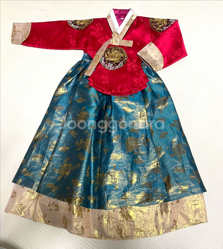 여아용 전통 한복 4호 사이즈예요. 저희 아이 4세때 넉넉하게 입혔어요 빨간 저고리와 터콰이즈 치마가 고급스럽고 상태도 깔끔해 보여요. 얼집에서 단체 사진찍을때 넘 눈에 잘 띄고 색상이 비비드해서 진짜 예뻤어요 보기보다 입었을 때와 사진찍었을때가 더더 예뻐요^^ 이염없이 상태 좋아요