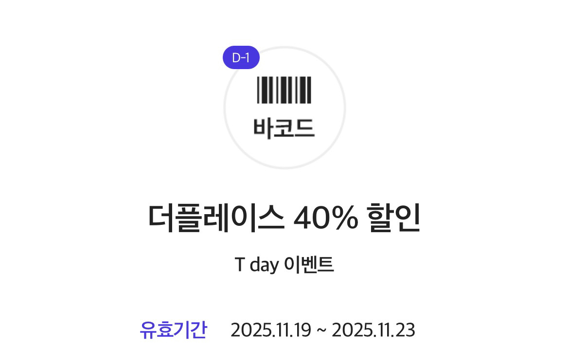 더플레이스 40% 할인 📌* 더플레이스 매장은 정가 기준 주문 금액 150,000원 한도 안에서 최대 60,000원 할인받으실 수 있습니다. 📌유효기간: 2025.11.23. 📌쿠폰 사용 방법: 매장 직원에게 쿠폰 제시 입금확인 후 쿠폰 바로 보내드립니다!