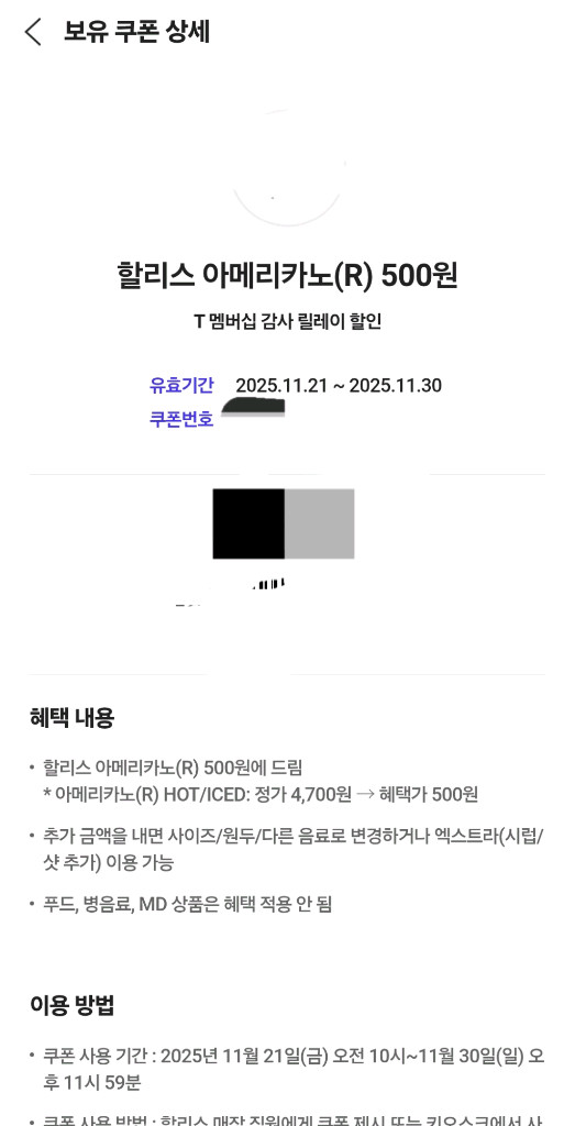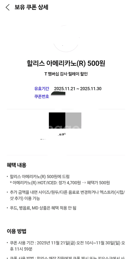 할리스 아메리카노(R) 500원에 구매가능한 쿠폰입니다. 2025년 11월 30일까지 사용 가능합니다.
