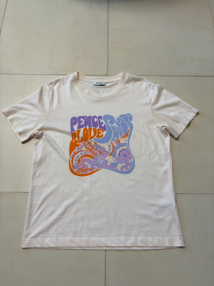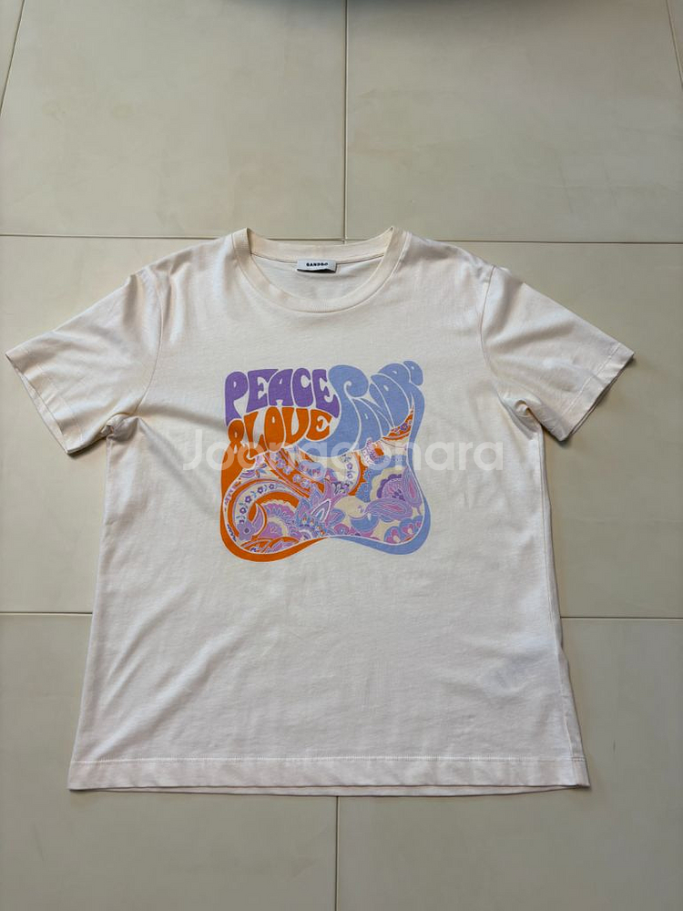 산드로 여성 반팔티셔츠 새거사서 딱 두번 입었어요. 완전 새하얀 화이트는 아니고 미색 섞인 화이트에요. 가운데 로고 패턴이 과하지 않고 포인트주기 좋아요. 프리사이즈이고 총장 63cm, 겨드랑이 가슴 단면 49cm정도 됩니다. 상태 깨끗합니다. gs반값택배로 보내드려요.