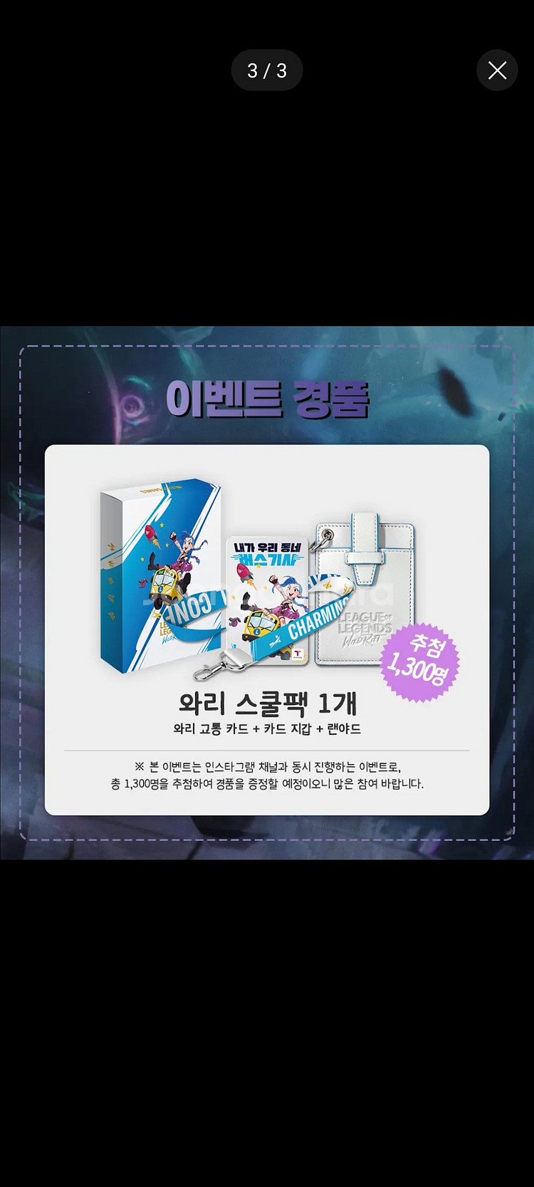 와일드리프트 스쿨팩입니다 2023년도 와일드리프트kr 유튜브 채널 게시물 이벤트 경품입니다 경품 내용은 22년 10월 발행된 티머니 카드라고 하네요 경품 내용 유무때문에 올려둔 사진처럼 사진만 찍고 다시 덮어뒀습니다(열고 닫는 뚜껑식 박스입니다) 관심있으신 분 채팅주세요