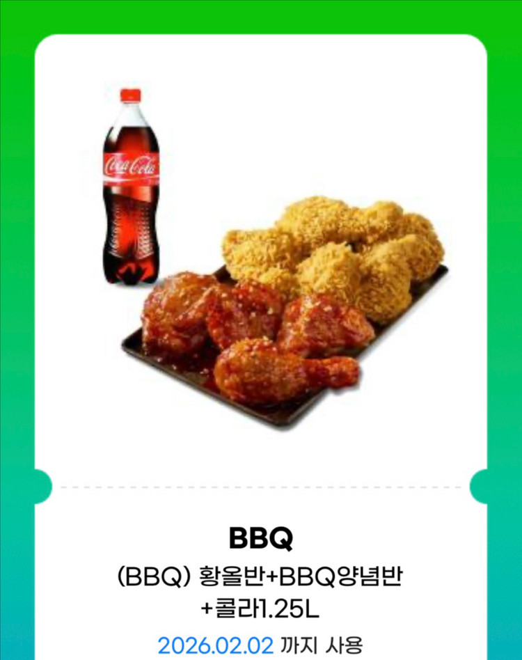 BBQ 황올반+양념반 +콜라1.25L(26500->21500) 챗주세용