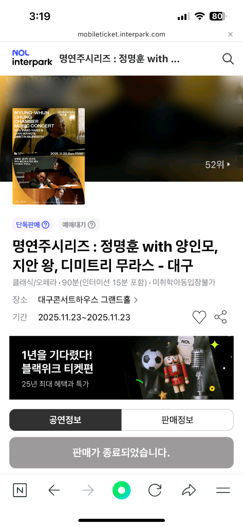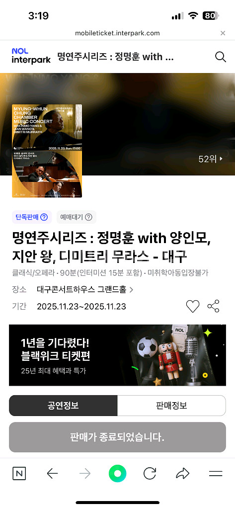 11/23 일요일 대구콘서트하우스 명연주시리즈 콘서트 티켓(정명훈) 합창석 1장 팝니다.