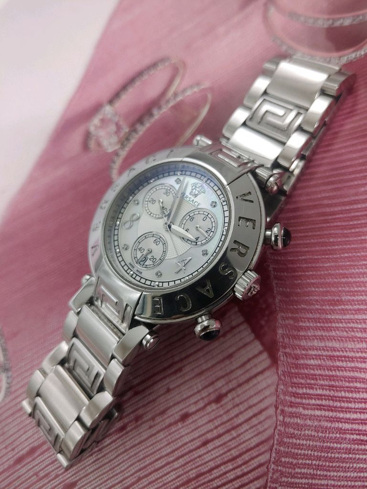 *케이스크기:40m/m(남녀공용) *사파이어글라스 *자개문자판 *6P 다이아인덱스 *크로노기능(스톱워치기능) *시계줄:19센치정도 *swiss made 베르사체 정품이며 까르띠에와 동일한 무브가 들어간 고급제품 입니다 (건전지 교체시 종로 시계장인이 말해줌) 미세잔기스등은 있으나 전체적인상태 아주깔끔하며 건전지는 새로 교체하였습니다. 구성품은 없으며 사진상의 케이스에 넣어서 드립니다.