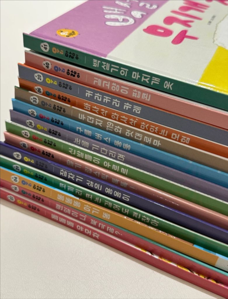 우리 아람이 전권 들였다가 다른 책들이 많아 방출하고 아쉬워서 인기있는 책들만 따로 구매해서 보관했었어요. 몇 번 읽어주지 않아 새책이나 다름 없습니다. 창작 책들이 요즘 워낙 많아서 우리 아람이는 단권들로만 읽혀도 충분한거 같아요😊 구매 책 13권 + 샘플로 받은 책까지해서 총 14권입니다