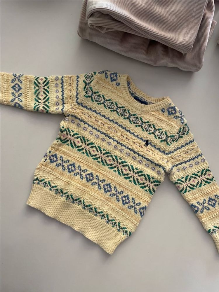 폴로 랄프로렌 키즈 니트 스웨터 4t사이즈예요. 베이지 바탕에 그린과 블루 패턴이 예쁘고 상태도 깔끔해 보여요. 아이가 예쁘게 입을 수 있는 고급스러운 디자인입니다.