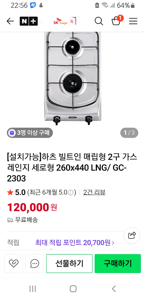 빌트인 매립형 2구 가스레인지예요. 설치 가능한 상태로 깔끔한 실버 컬러입니다. 주방 리모델링이나 새 설치용으로 좋을 것 같아요.