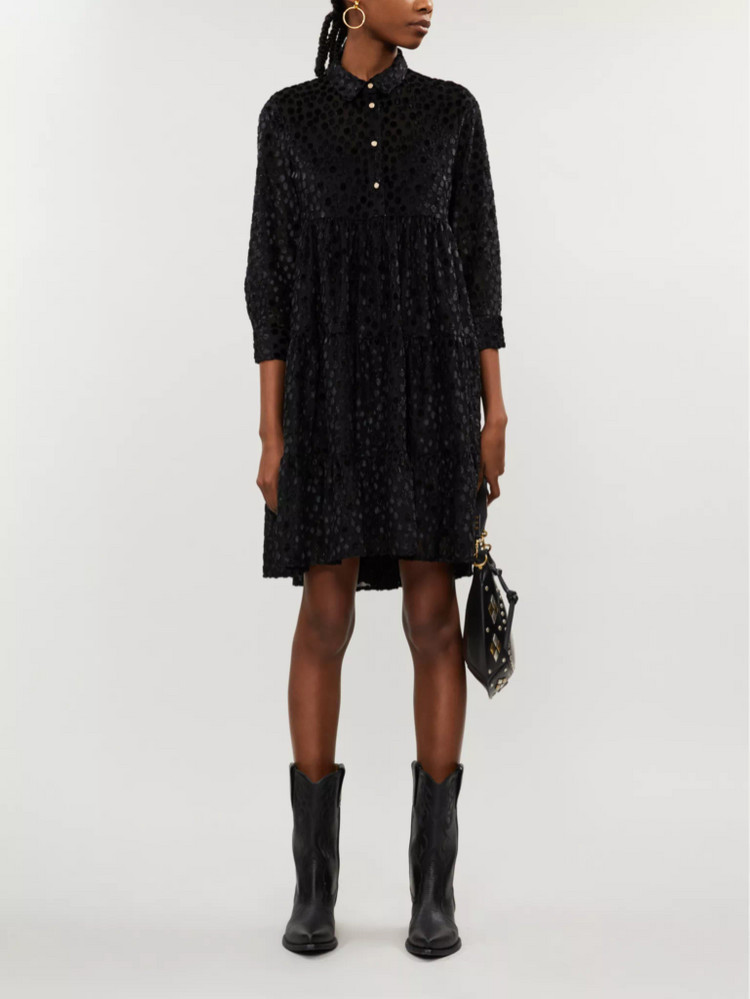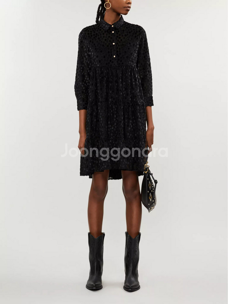 (새상품) 마쥬 폴카 도트 블랙 벨벳 원피스 1사이즈 스프레드 칼라 단추 커프스가 달린 긴 소매 골드 단추 포인트 A라인 실루엣 올오버 폴카닷 데보레 패턴 반투명 소재에 블랙 슬립 이너 포함 7-8부 길이의 소매 소재: 메인: 폴리에스터 95%, 엘라스테인 5% 안감: 비스코스 100% 모델 175m에 1사이즈를 착용 실측 총장 92cm정도 택있는 정품이라 선물도 가능하답니다