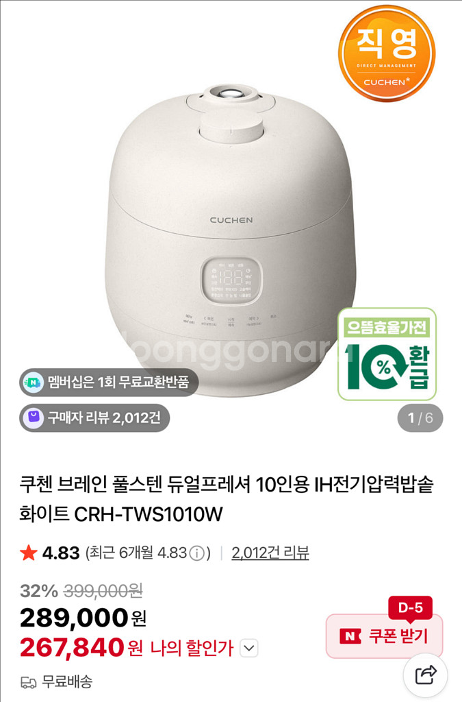 쿠첸 브레인 풀스텐 듀얼프레셔 10인용 IH압력밥솥 CRH-TWS1010W