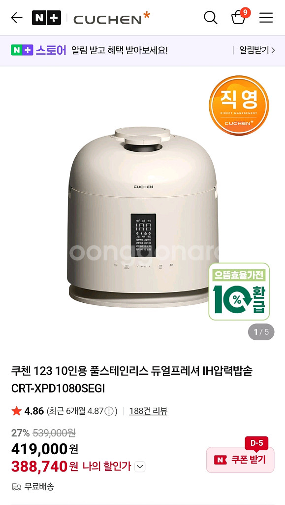10인용 IH압력밥솥이에요. 깔끔한 화이트 색상으로 어떤 주방에도 잘 어울릴 것 같아요. 단순개봉 새제품 상태로 판매합니다!