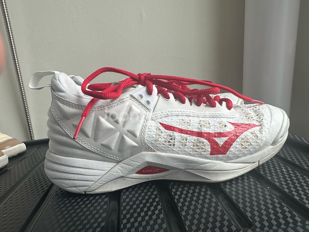 미즈노 운동화입니다 흰색 바탕에 빨간색 포인트가 들어가 있습니다 사이즈는 235mm입니다