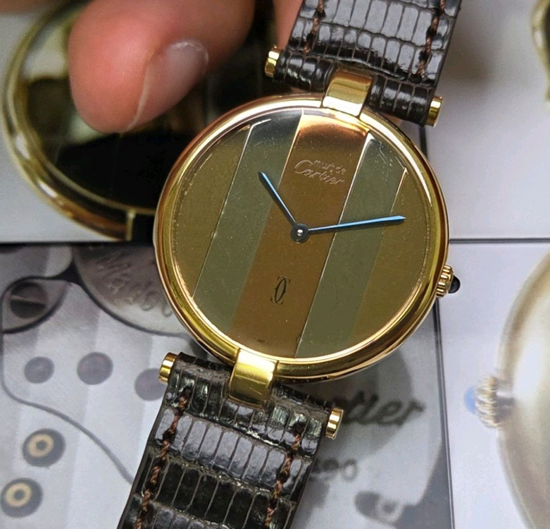 ⚠️아래 내용 꼭 읽고 문의주세요⚠️ !! 교환, 업자 절대 사절. 상식밖 거래, 비매너, 사적 요청, 의미없는 대화 X !! 아무런 대화없이 결제하지 마시고 대화 먼저 부탁드리며, 실시간 재고 확인 및 충분한 안내 후 거래 진행 !! 제 사진을 도용해 터무니없는 가격에 올려놓는 도용 사기글들에 주의하세요 !! 구매 전 상점 정책 필독 !! 빈티지 시계 및 기계식 시계에 대한 이해도가 있는분만 연락주세요 _________________________________ 레어] 빈티지 까르띠에 머스트드 방돔 희귀 트리니티 미러판 쿼츠 남성용 (감정서 포함) 스틸이 아닌 법정순은 925 케이스에 골드도금이 들어간 머스트드 라인의 방돔 쿼츠 모델로, 그 중에서도 동일 개체 찾아보기 힘든 극희귀 트리니티 미러 다이얼 버전입니다. 옐로우 골드-핑크골드-화이트 골드의 컬러바로 구성된 귀한 트리니티 다이얼이라 수집 가치가 매우 높으며, 다이얼만으로도 금액 차이가 상당히 납니다. 확실히 일반적인 방돔 모델 대비 멋이나 품격이 뛰어나니 희귀 모델로 수집하고 싶은분께 강추드립니다. 양도전 큰 비용 들여서 전체 최고급 폴리싱, 맞춤 스트랩 제작해 체결 완료해 바로 착용하시면 됩니다. 추가적으로 감정서까지 별도 발급해두었으며, 감정서 등급도 완벽한 시계에만 부여되는 'Very good' 등급받았습니다. 핀버클도 오리지널 제치입니다. 아담한 24mm 여성용아니고 30mm 남성용으로 발매됐던 시계라 손목 얇은 남성분이나 여성분이 착용하시면 아주 잘 어울리고 예쁩니다. 좋은 주인 찾기위해 일반 모델 가격과 동일하게 올리며, 오셔서 실착해보시고 결정하세요. 직거래 군자역입니다.