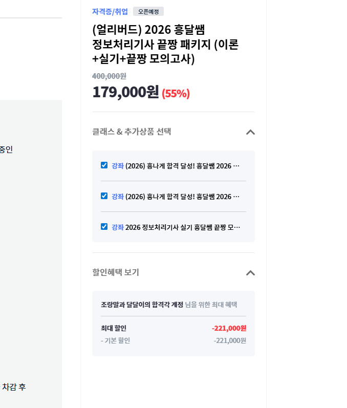 개인정보(거래정보)를 주고받는 행위는 사기에 노출될 수 있으므로 즉시 중고나라로 신고해 주세요2026년 정보처리기사 시험 대비 온라인 강의 패키지예요. 끝판 패키지로 최신 강의와 문제집이 포함되어 있어서 시험 준비에 도움이 될 거예요. 오전에 들으신 분을 구합니다.