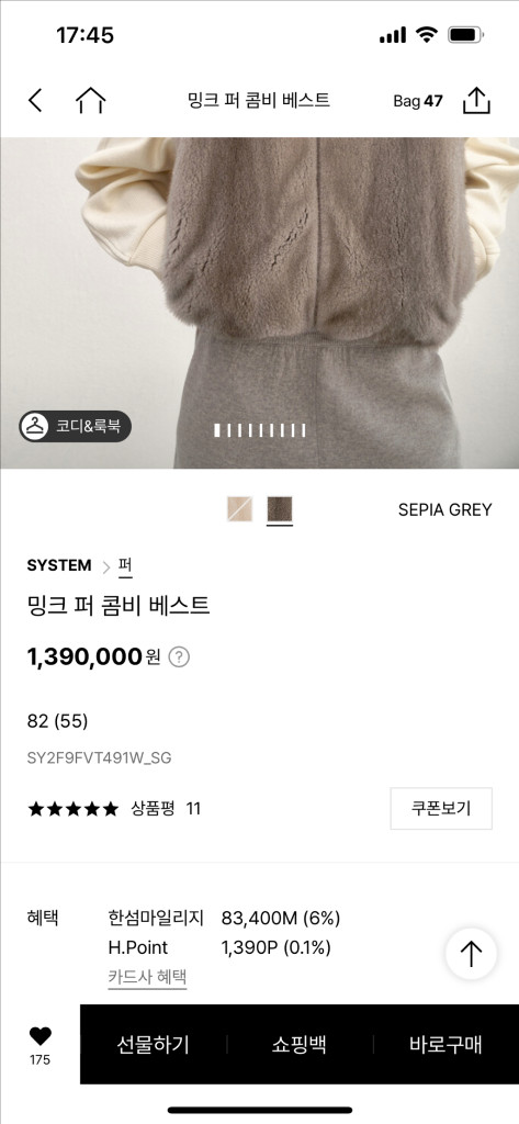 25년 10월 구매 두 색상 모두 샀는데 이 색상이 생각보다 손이 안가서 팔아요 퍼 나오자마자 상태 보고 골라사서 양품이에요 서울 둔촌동역 직거래 가능 현백 구매 제품입니다
