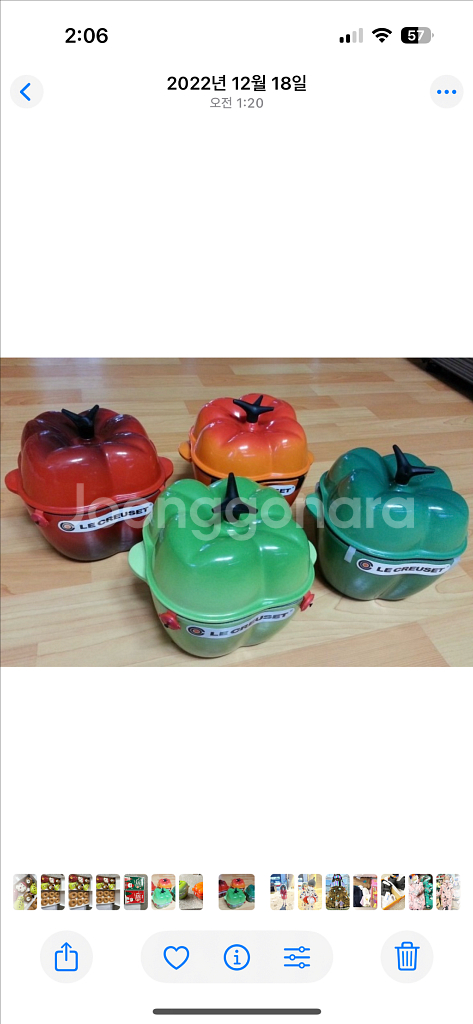 르크루제 무쇠냄비 피망4종이에요. 빨간, 오렌지, 그린.팜이구요. 빨강.팜은 박스있구요.오렌지랑 그린은 국내출시안된 제품으로 구입당시부터 박스는 없네요.ㅠㅠ 어렵게 취미로 예전부터 모아오던 냄비인데 유학으로 정리차 보내게 되었네요. 전부 상태는 사용안한 새상품으로 상태는 좋습니다. 구입원하시면 자세한사진은 보내드릴께요~^^ 소장가치있으니 저렴한 가격에 들이세요. (아오리사과.호박도 소장중…) 되도록이면 무거워서 직거래원해요. 상일동에서 직거래가능합니다.