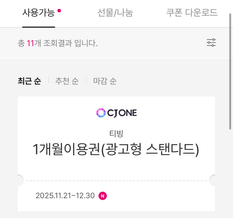 티빙 1개월 광고형 스탠다드 이용권입니다 ~25년 12월 30일까지 등록 가능