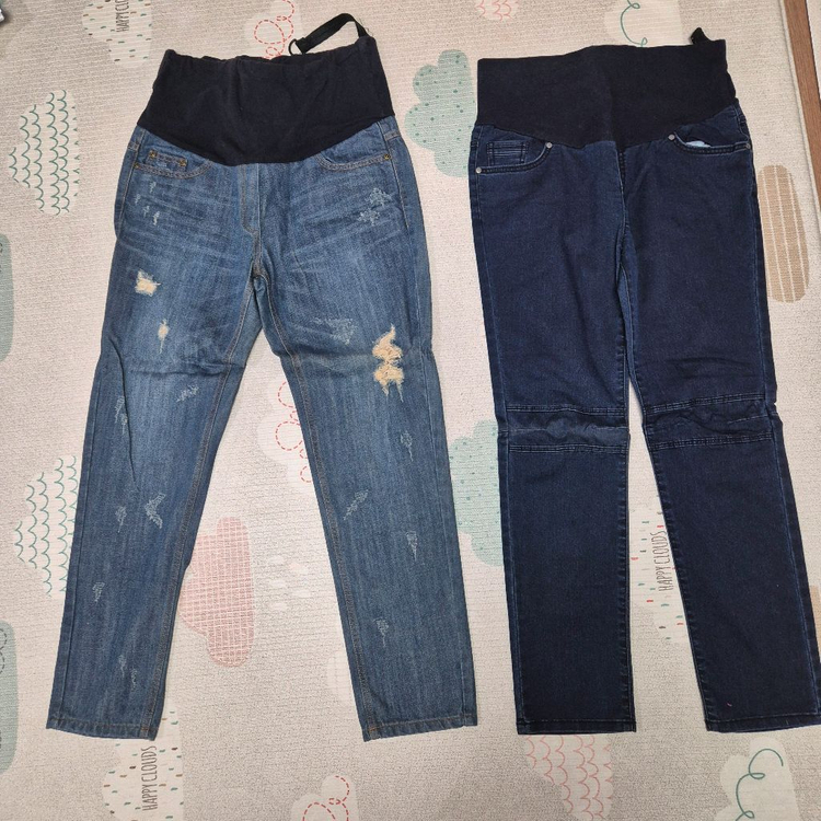 임신 중 편안하게 입기 좋은 데님 바지 2벌이에요. 상태 양호하고 임부복으로 활용하기 좋습니다. 77사이즈 엉덩이둘레 100 편의점택배 2500포함