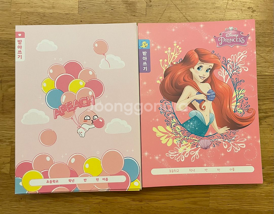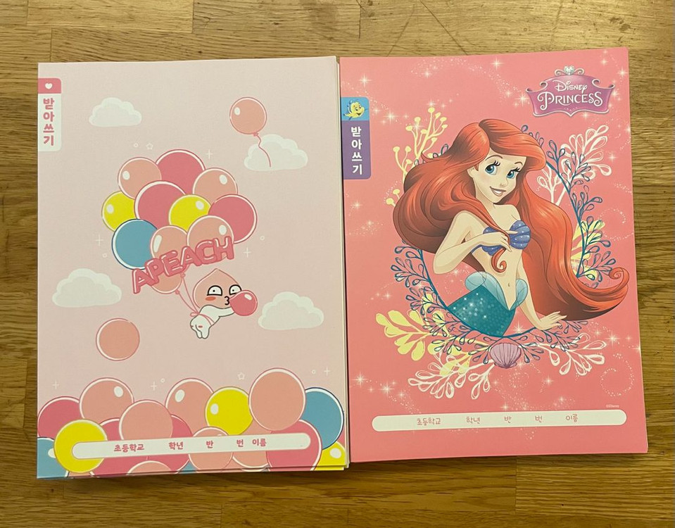 디즈니 프린세스 인어공주와 어피치 캐릭터가 그려진 받아쓰기 공책 세트입니다~ 어피치 9권 + 인어공주 6권 장소 : 서울영서초등학교