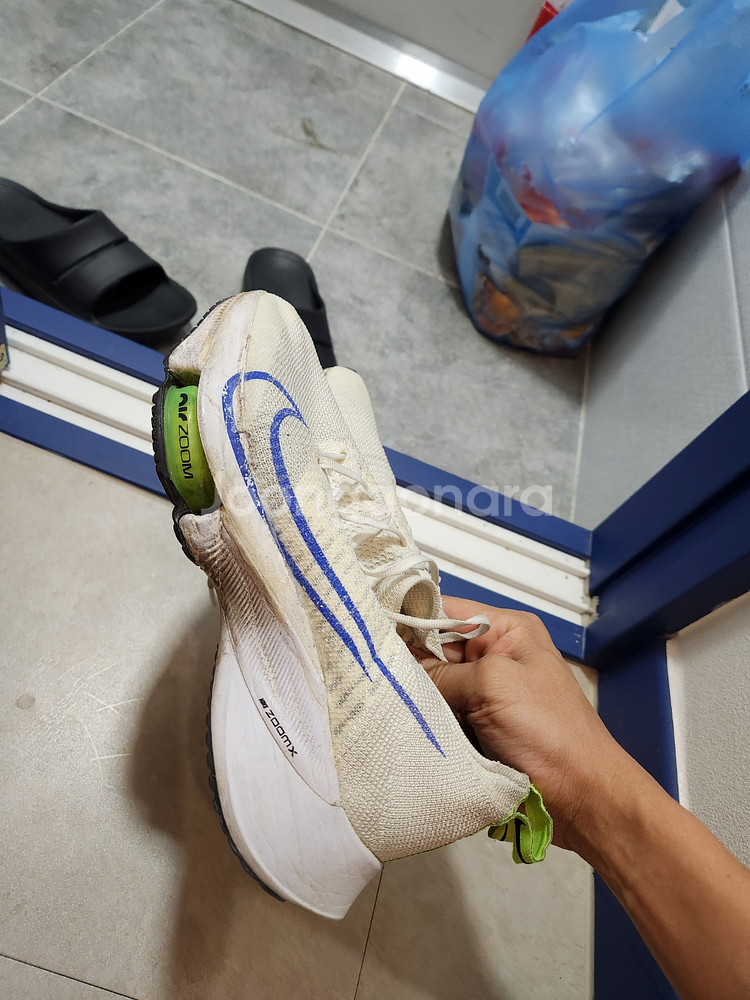 베이지/화이트 컬러에 블루 포인트가 들어간 깔끔한 디자인이에요. 사용감은 있지만 아직 착용 가능한 상태입니다. 나이키 알파플라이1 초창기 모델 판매합니다. 사이즈 265 러닝화 수명은 다했고 패션용으로 신으실 분 연락주세요. 직거래 장소: 부산시청역 옆 양정청소년수련관