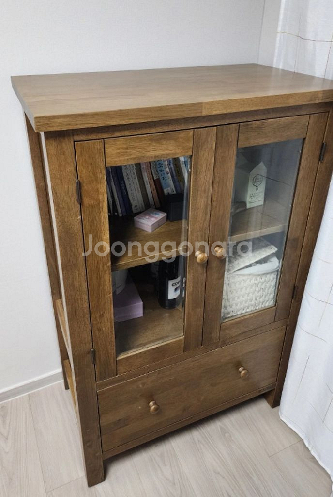 원목 소재의 깔끔한 디자인의 수납장이에요. 신혼혼수로 구매했는데 장식장을 쓸일이 없어서 판매합니다. 단순하고 단정한 가구입니다. 눈에 보이는 기스는 사진찍어두었습니다. 사이즈는 사진 참고해주세요 브라운 색입니다. 원목이라 상당히 무겁습니다. 두분이서 오셔야 합니다. 살림에 애정을 쏟으시는 여유로운 주인분을 만나길 바랍니다. https://www.inartshop.com/goods/view?no=491