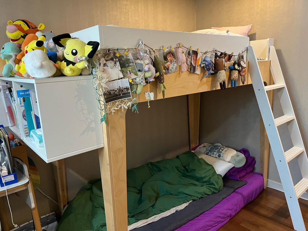 아이들이 좋아하는 2층 침대에요 이층 베드는 거의 사용하지 않았어요 베드만 따로 70만원 줬어요 ㅠㅠ 밑에서 저렇게 따로 토퍼깔고 자느라 ㅡㅡ 이사로 급 처분합니다 ㅠㅠ