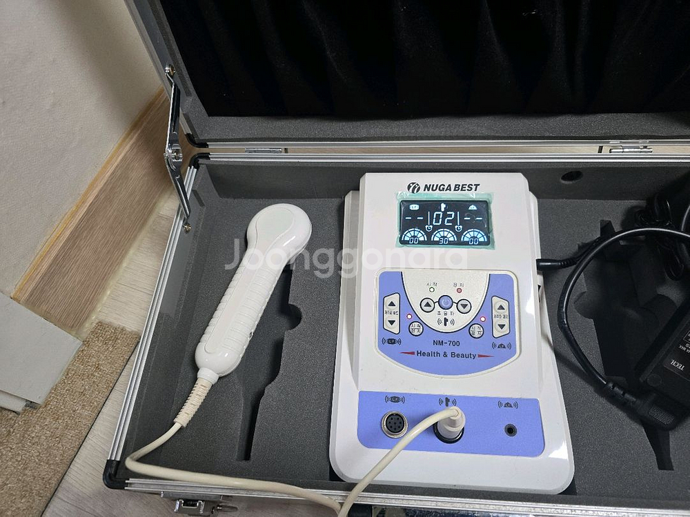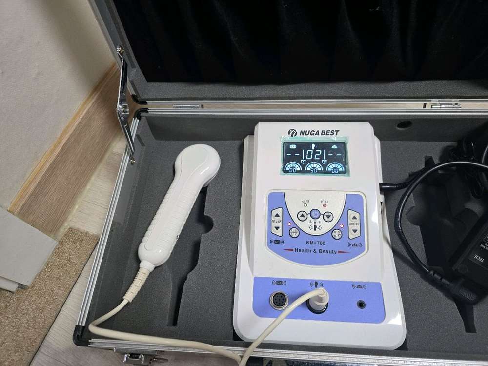누가베스트 브랜드의 전자파 기능기예요. 케이스와 구성품이 모두 포함되어 있고 상태도 깔끔해 보입니다. 건강 관리나 미용 목적으로 사용하기 좋을 것 같아요. 거진새거여요 사용안한것도 있고 5회미만사용입니다