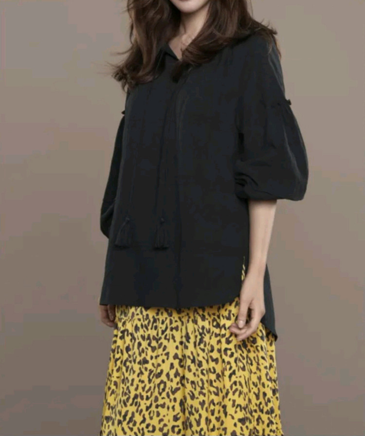 🎯 GS택배 가능합니다. (일반택배 3500원, 반값택배 1800원 추가해 주세요.) 엣지(A+G)의 보헤미안 블라우스입니다. 크링클 가공으로 내추럴한 형태감을 잡아줍니다. 9부소매로 테슬 장식이 멋스럽고, 보헤미안 패턴이 매력적입니다. 옆트임 있고, 앞뒤 기장차 있습니다. 블랙 색상으로 여유로운 66사이즈입니다. 접어두어서 구김 있습니다.