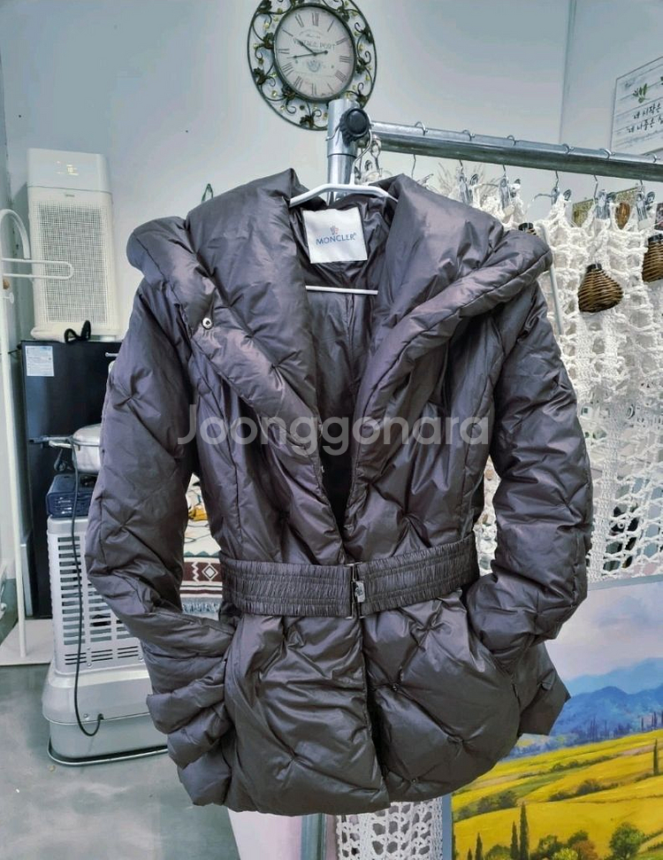 몽클레어 여성 패딩입니다 후드 스타일이고 벨트 디테일이 있습니다 충전재는 솜털 50%, 깃털 50%로 구성되어 있습니다