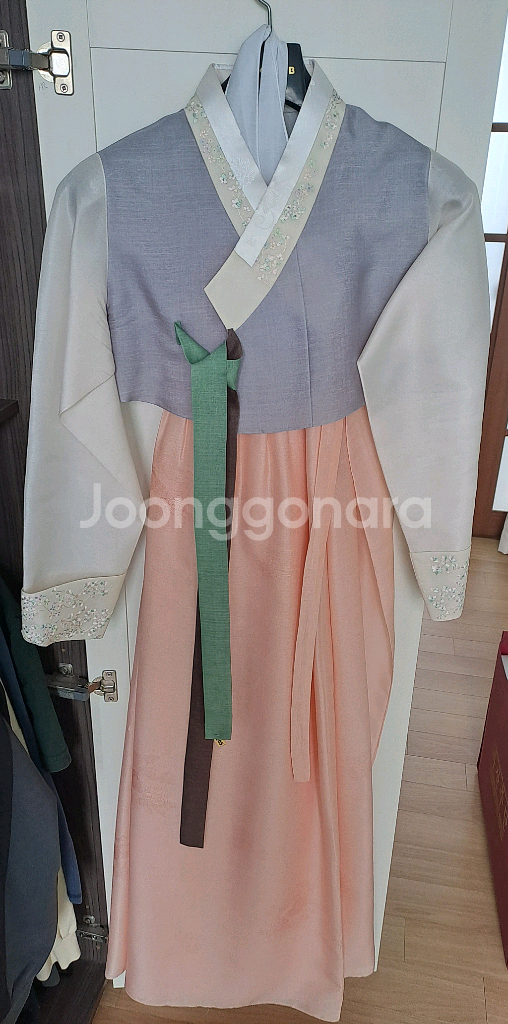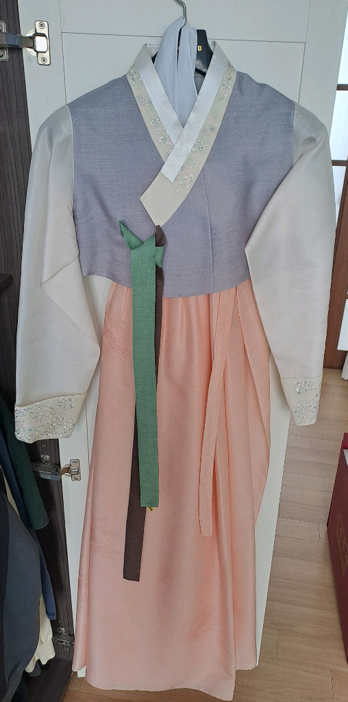 여성 한복입니다 - 핑크색 치마에 얼룩이 있습니다(사진 참고) - 신발과 가방이 함께 들어있습니다 기장 165cm 사이즈 66-77 발사이즈 245mm 사이즈 넉넉해서 수선해서 입으셔도 될 것 같아요~ 결혼식에 한번입고 드라이 했는데 저고리에 얼룩이 묻어 있네요.. 부산에서 50만원 넘게 주고 구매했는데 세트로 저렴하게 드려요^^