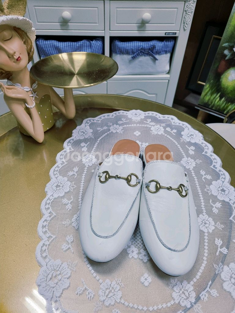 구찌 시그니처 홀스빗 장식이 포인트인 화이트 뮬이에요. 깔끔한 디자인으로 어떤 스타일에도 잘 어울리고, 상태도 양호합니다.