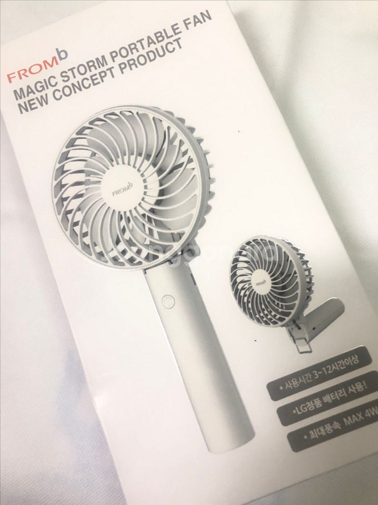 화이트 컬러. 제품 작동 여부만 테스트한 새제품입니다. 스티커도 제거하지 않았습니다. 일반 반값 택배 가능합니다. 미사용새제품)프롬비 매직 스톰 포터블 팬-휴대용 선풍기