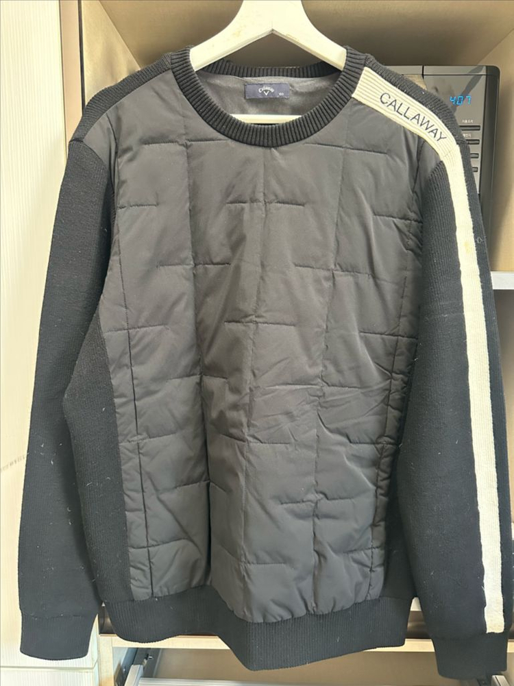 캘러웨이 남성 방풍 니트 L 사이즈 정면 가슴부분만 패딩처럼 되어 있습니다 사진첨부 팔 부분 얼룩이 있어 싸게 처분합니다 두께감 좋습니다