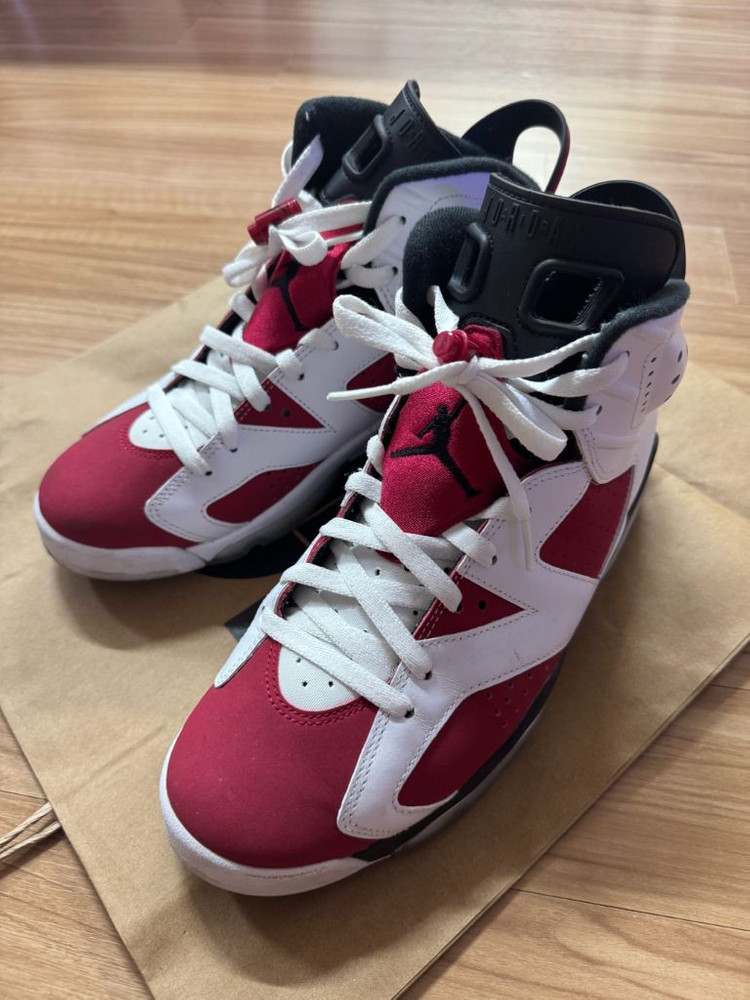 나이키 조던 6 카마인 275사이즈입니다. 나코탭 제품입니다. 10회정도 신었던 것 같아요. 밑창 내구도 보이시는 것과 동일합니다. 색 바램? 없습니다. 마음 편하게 생각해서 박스도 버리고 신어서 그런지 사용감은 있어보이나 스웨이드 및 가죽 까짐, 찍힘 등 보이지 않습니다. 전체적으로 양호하다 생각이듭니다. 양심있게 판매함니다. 사진을 자세하게 촬영하여 확인이 가능하실 거라고 생각합니다. 세탁 한 번 하시고 예쁘게 잘 신으시면 될 것 같습니다.