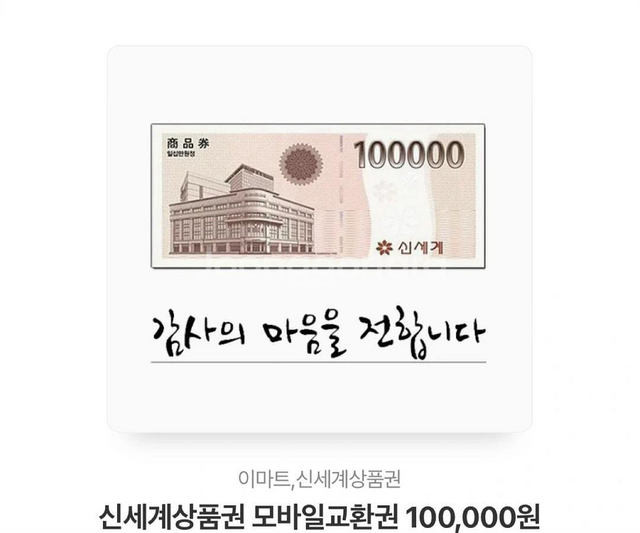 신세계상품권 모바일교환권 10만원권 판매해요. 이마트와 신세계에서 사용 가능하고 상태 양호합니다. 2장 잇어요