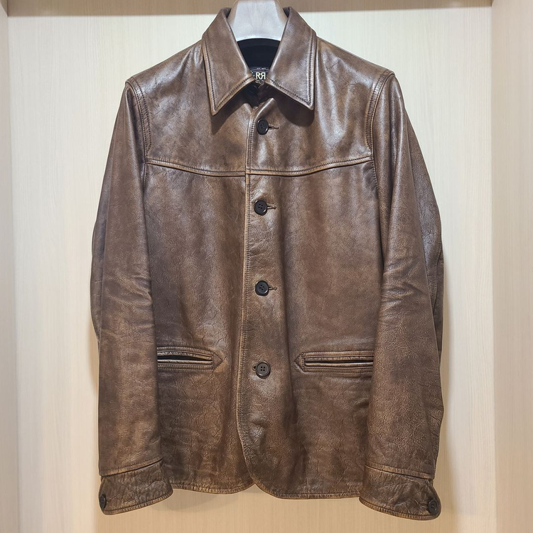 더블알엘 레더 카코트 S 사이즈입니다. 가슴팍 포켓이 없고 뒷판 허리 조절 시스템이 다른 구형 버전입니다. 더블알엘의 스테디셀러로 빈티지 태닝 워싱이 인상적인 중후한 다크브라운 컬러입니다. 구형 버전 이후로는 색상이 더 옅어졌는데 저는 개인적으로 이때의 더 짙은 색감이 훨씬 멋있는 것 같습니다. 현행품은 공홈/매장에서 360만 원에 판매 중인 것으로 알고 있습니다. 자켓/코트 48사이즈 또는 L/100을 입으시면 잘 맞으실겁니다. 아시는 분들은 아시겠지만 더블알엘 카코트는 눈으로 보기와 달리 상당히 가볍고 착용감이 우수합니다. 제품은 구매 후 1회 착용한 후 계속 보관 중입니다. 판매 사진 중 가장 마지막 사진을 보시면, 왼쪽 소맷부리 부근에 작은 실 스크래치가 있습니다. 그 이외에는 신품과 거진 동일한 컨디션입니다. 자켓 본품만 있고 두꺼운 정장용 옷걸이 하나 같이 드리겠습니다. 선불 택배로 거래도 합니다만 가능하시면 제품 직접 보시고 가져가셨으면 좋겠습니다. 서울 5호선 명일역에서 거래 가능합니다. 추가적으로 사진이 더 필요하시거든 알려 주십시요.