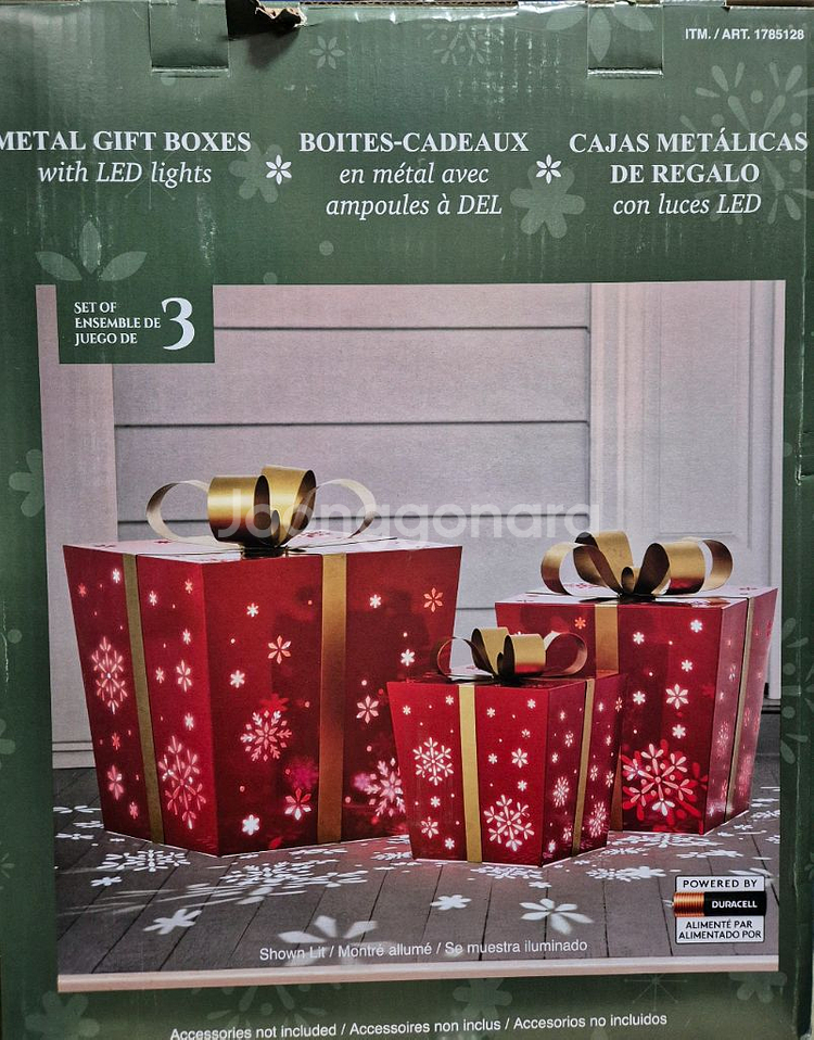 코스트코에서 판매하는 메탈 선물 상자 LED 조명 3개 세트입니다 - 빨간색 바탕에 흰색 눈꽃 디자인이 되어있습니다 - 크리스마스 장식으로 활용하기 좋습니다 - LED 조명이 들어있어 은은한 분위기를 연출할 수 있습니다 새상품입니다 제품 특징 우아하고 고급스러운 메탈 재질의 크리스마스 선물 박스 모양 장식품 3개 세트 웜 화이트 LED 불빛 효과 타이머: 6시간 On, 18시간 Off 선물 박스1: L38.10 x W38.10 x H46.99cm 선물 박스2: L30.48 x W30.48 x H37.47cm 선물 박스3: L22.86 x W22.86 x H27.94cm 선물 박스 당 AA 사이즈 건전지 3개, 총 9개 필요 (포함) 실내와 비바람의 영향을 받지 않는 현관 등에서 사용 가능